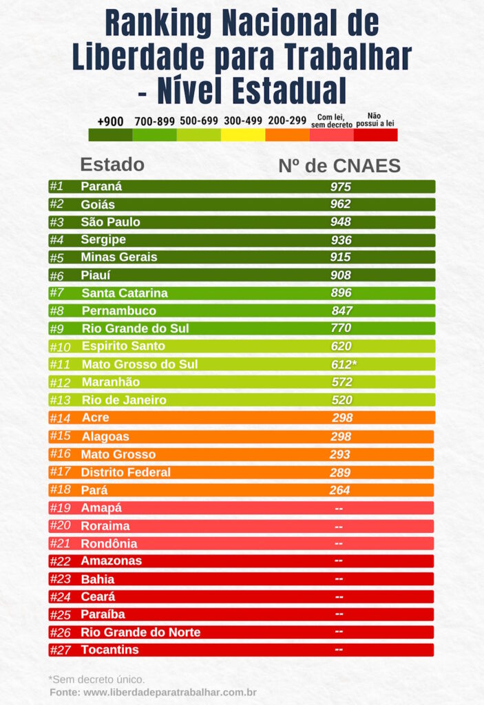 Com a publicação da Resolução CGSIM-MG nº 4, Minas Gerais ampliou o número de atividades de baixo risco dispensadas da alvarás para 915 CNAEs. Agora, o estado é o segundo com maior número de CNAEs dispensados, atrás apenas de Goiás (962 CNAEs). O Governo de Minas Gerais é um dos principais parceiros do projeto Liberdade para Trabalhar do ILISP e este avanço contou com o apoio do projeto.